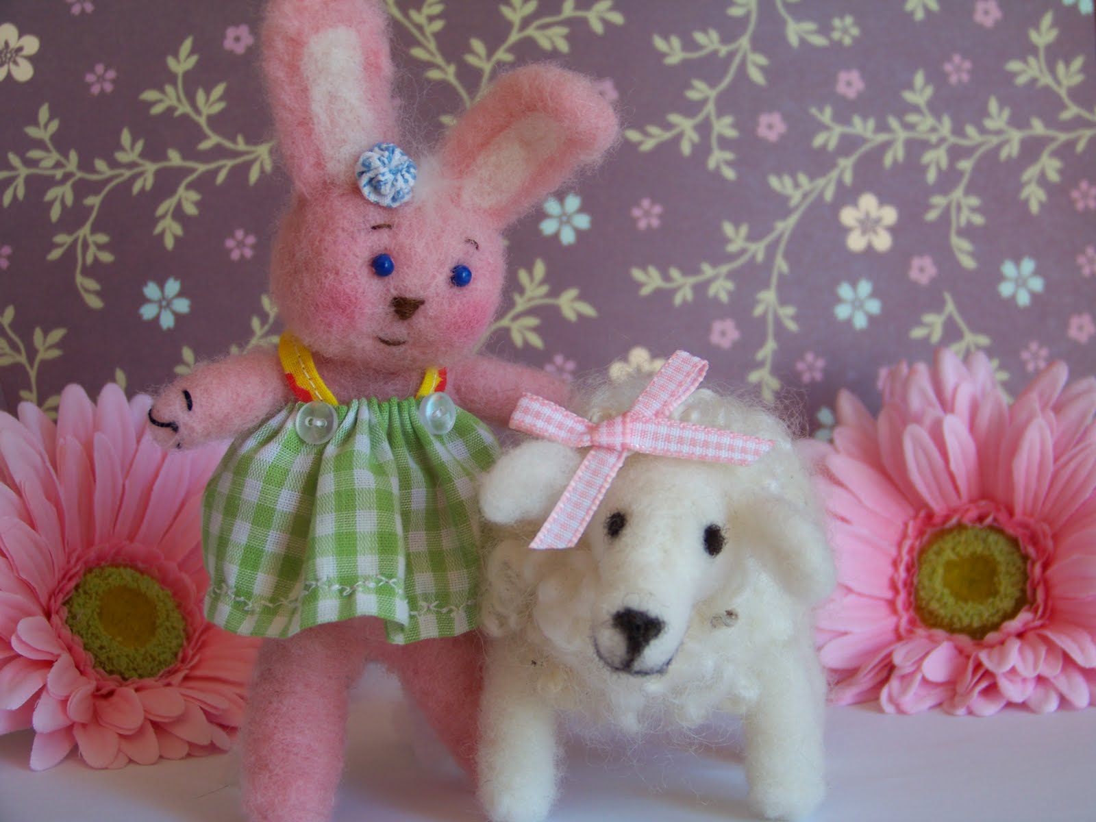 I have been feeling the need to be creative, so I got out Caitlin's wool stash and decided to do some needle felting. I was inspired by artist Jenn Docherty and her "wool felted friends." You can check out her work at http://www.jenndocherty.com/ . The lamb Cait and I worked on together a few weeks ago using our own "Eleanor's" curly wool. The pink bunny I worked on most of yesterday. Cait an I also had a great time with the photo shoot.
