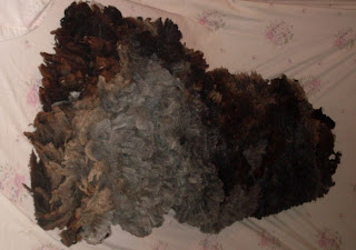 This past week we were planning on taking our wool to a place where it is processed. That includes washing, and carding wich is making it into roving, batting or a cloud. As we were weighing and getting everything ready to take, I started doing some calculations. With gas for a four hour trip, processing costs, and shipping it back to us it was going to be well over $200. Well I'm a pretty frugal person when it comes to something I can do myself. The other farmgals and I all agreed that the money would be better spent on things we want for the barn. So I have set myself a goal to get all the wool washed in the next two weeks.
